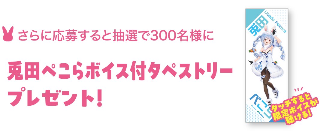 さらに、本特設サイトからご応募いただくと抽選で300名様に 兎田ぺこらボイス付タペストリーをプレゼント!