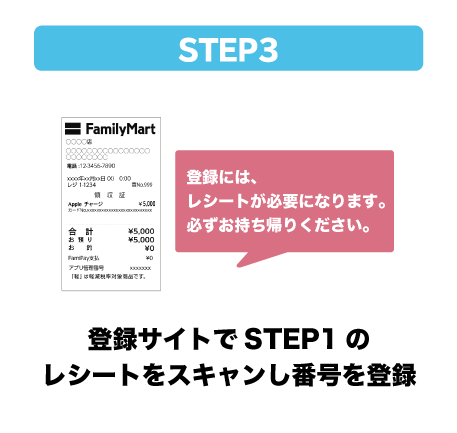 - 登録いただいた後、LINEメッセージ、受取情報の通知を受け取るまで、ファミリーマートのレジでApple Accountにチャージした際のレシートはお手元に保管いただきますようお願いいたします。