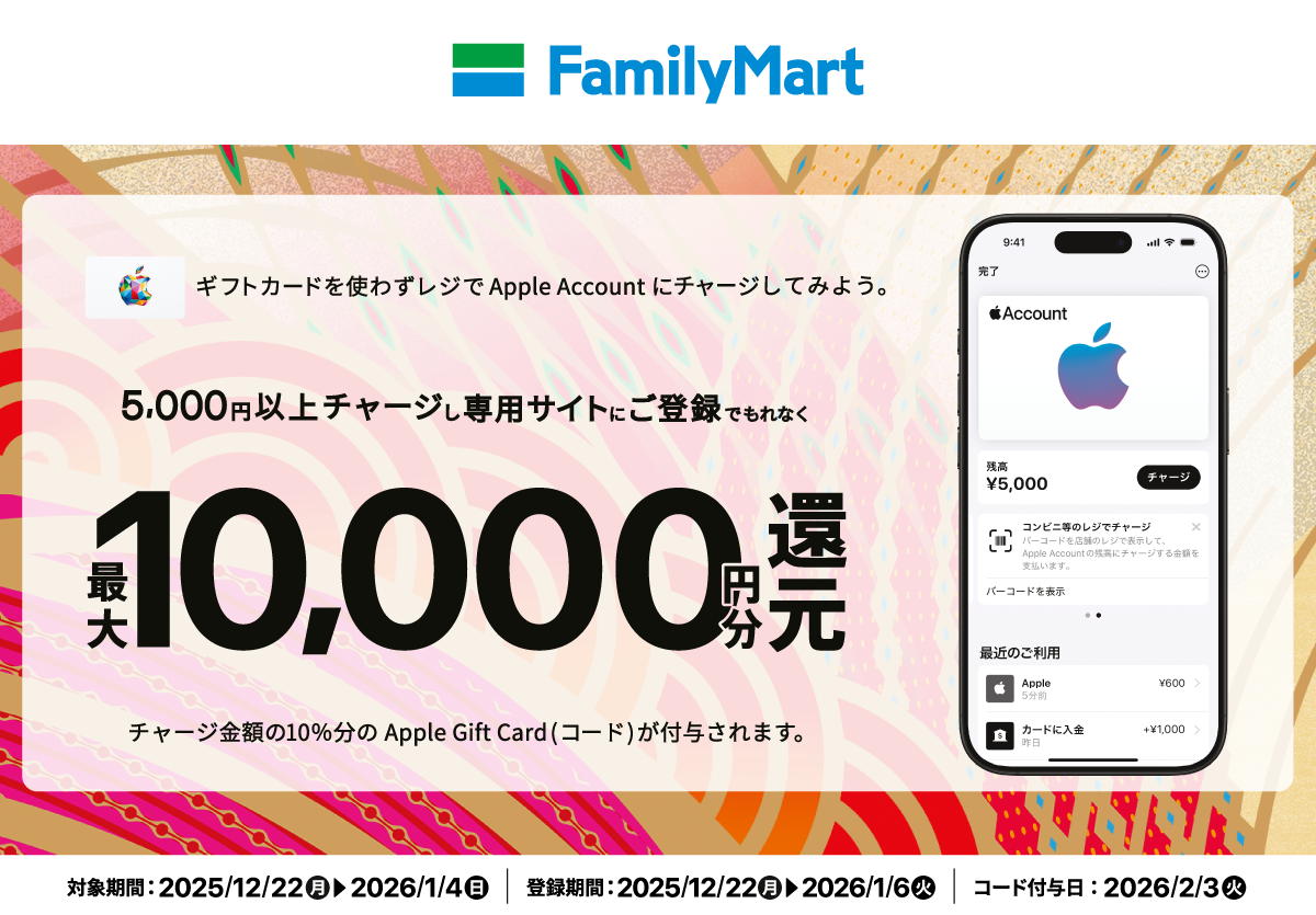 ファミリーマート各店舗のレジで、Apple Accountへ合計5,000円以上をチャージし、チャージ時のレシートを本キャンペーンサイトからご登録いただくと、合計チャージ金額の10%分(最大10,000円分)のApple Gift Card(コード)がもらえる!