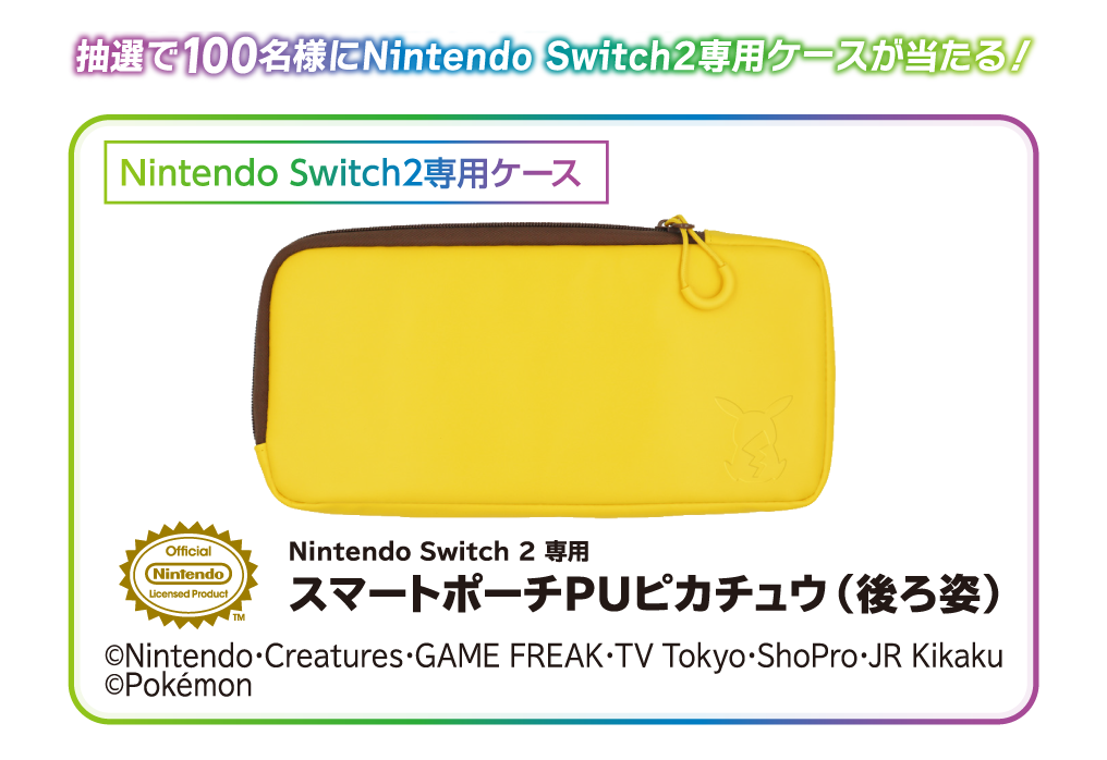 キャンペーン期間中に対象店舗にて対象商品のいずれかをご購入後、本特設サイトからご応募いただくと抽選で100名様に Nintendo Switch 2 専用スマートポーチPUピカチュウ(後ろ姿)をプレゼント!