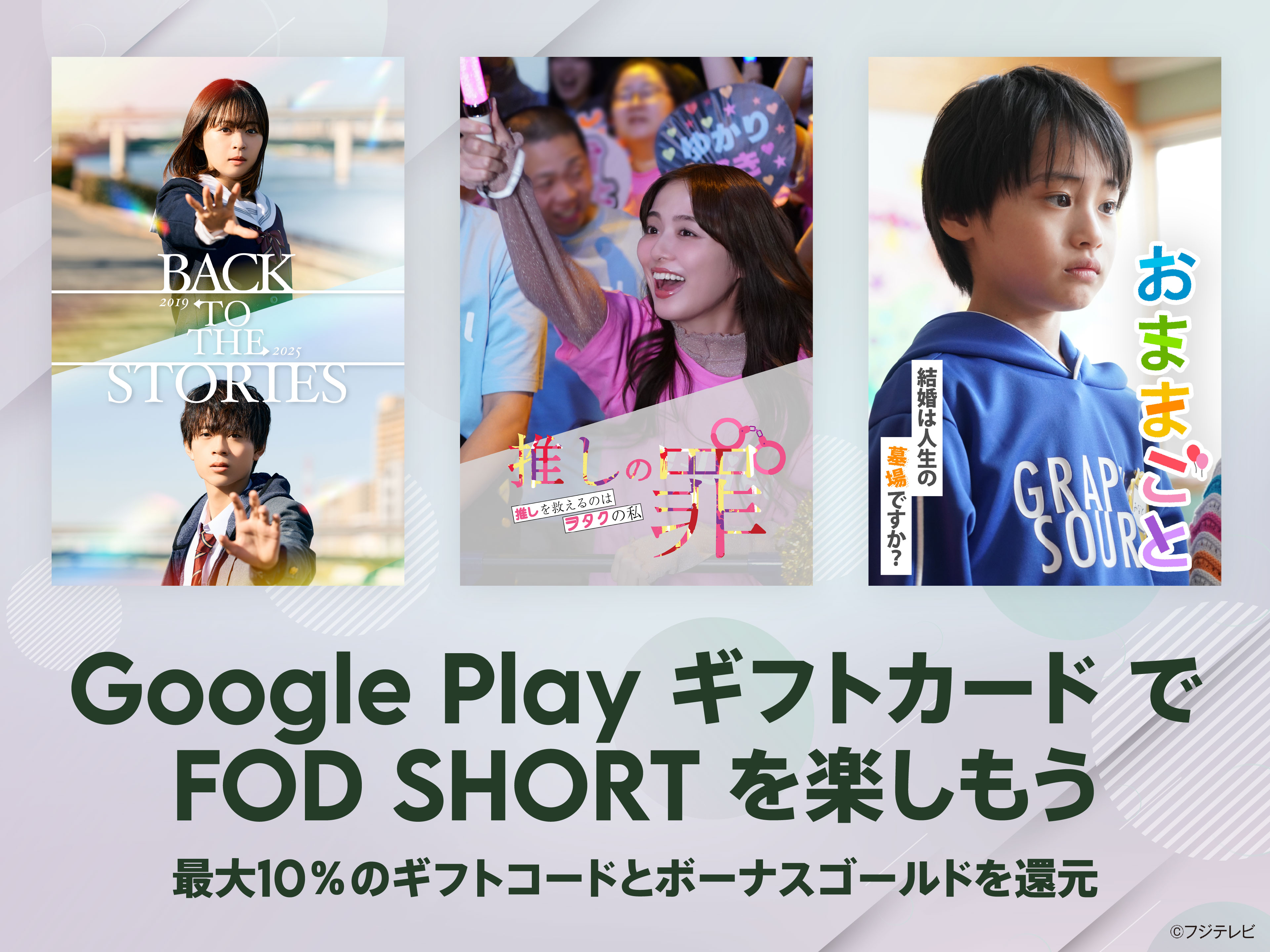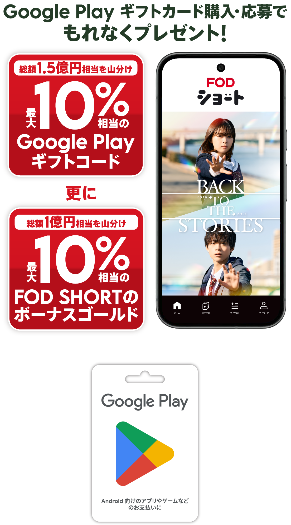 • 購入期間内に対象販売店でご購入いただき、本サイトからご応募いただくと、Google Play ギフトコードと FOD SHORT ボーナスゴールドの両方の特典に自動で応募されます。