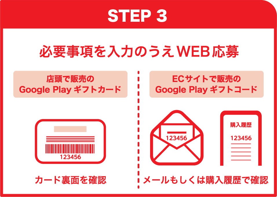 • Google Play 商品の購入 1 点につき 1 回、お一人様累計応募 250,000 円まで指定応募サイトにてお申し込みいただけます。