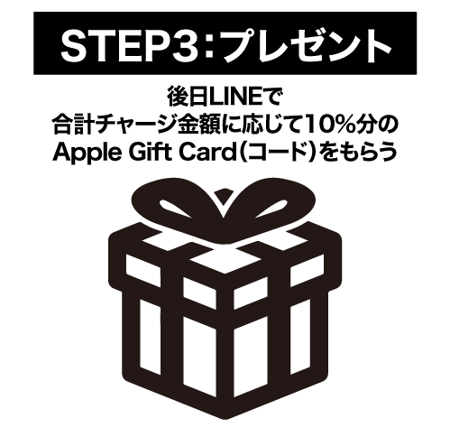キャンペーン期間中、ローソン・ナチュラルローソン・ローソンストア100のレジでApple Accountに5,000円以上チャージし、チャージ時のレシートをアップロードして応募すると、合計チャージ金額に応じた10%分(お1人様最大10,000円分)のApple Gift Card(コード)をプレゼント!