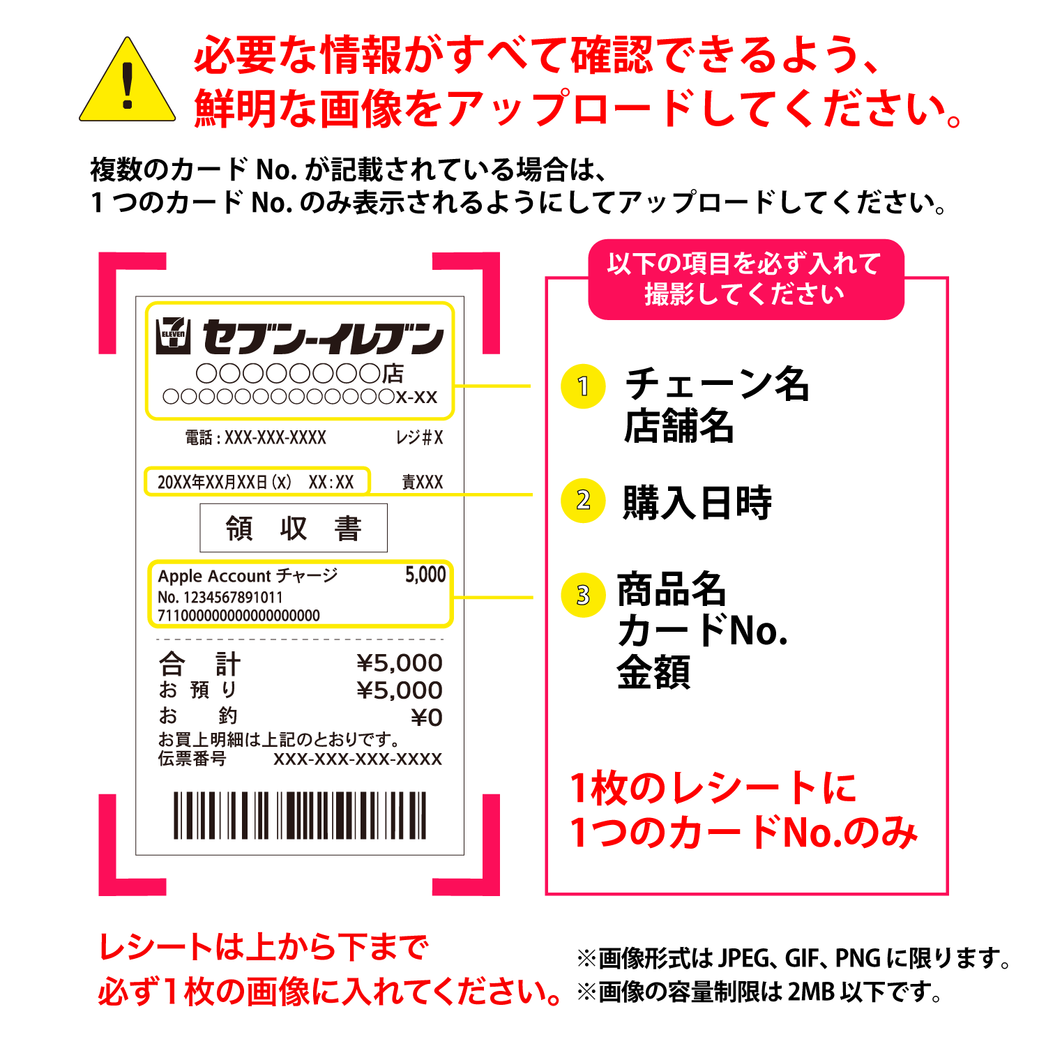 ・応募の際にアップロードするレシート画像に、複数のカードNo.が記載されていると応募はできません。その場合は、他カードNo.部分を隠すなどし、レシートに1つのカードNo.のみ表示されるようにして、アップロードしてください。